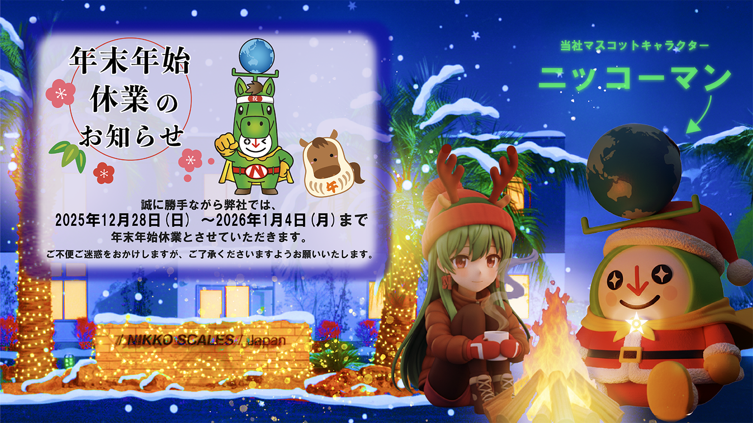 弊社では、2025年12月28日(日) ~2026年1月4日(月)までを年末年始休業とさせていただきます。