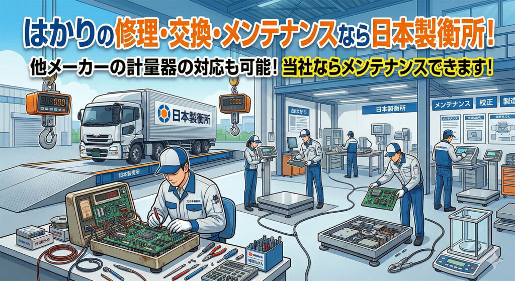 私たち日本製衡所は、自社製品の製造・販売だけでなく、本来であれば対応が困難とされる「他社メーカー様」のトラックスケールや台はかりの修理、保守メンテナンス、に対応できるメーカーです。